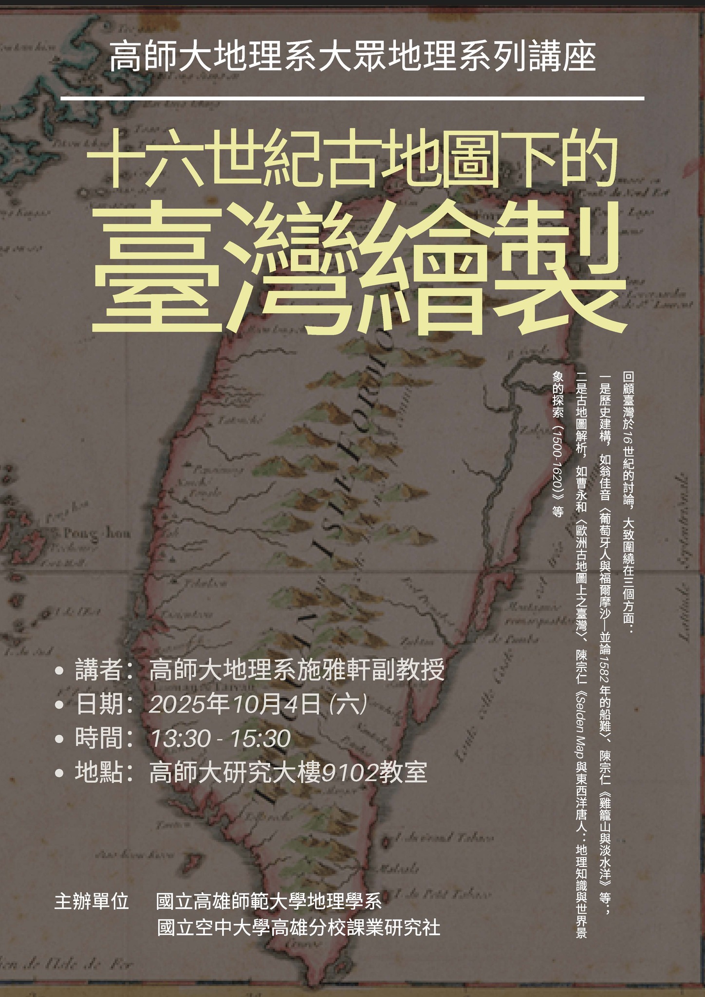 【大眾地理系列講座】主講人:施雅軒 副教授「十六世紀古地圖下的臺灣繪製」