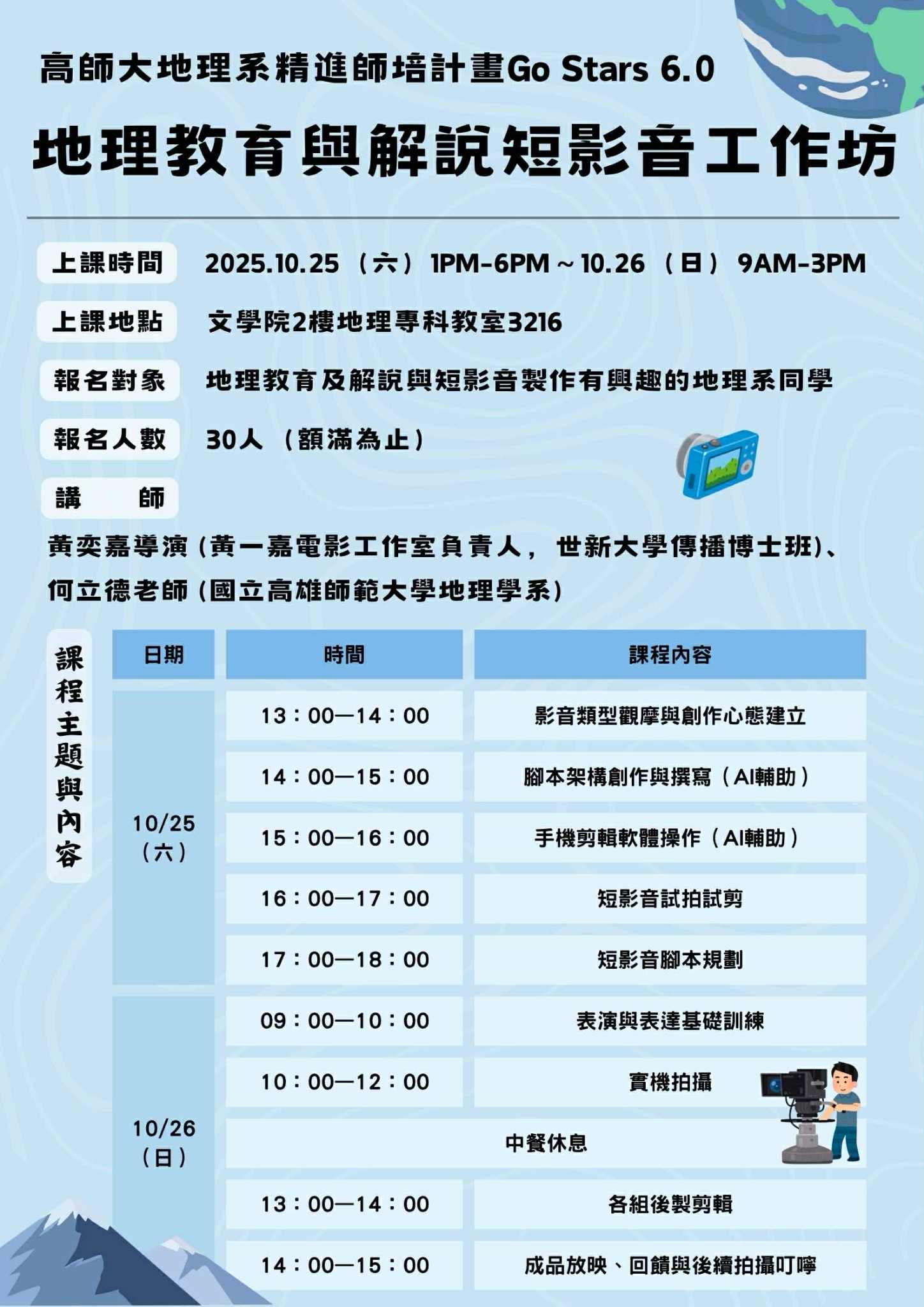 對象:對地理教育與短影音解說製作有興趣的地理系同學