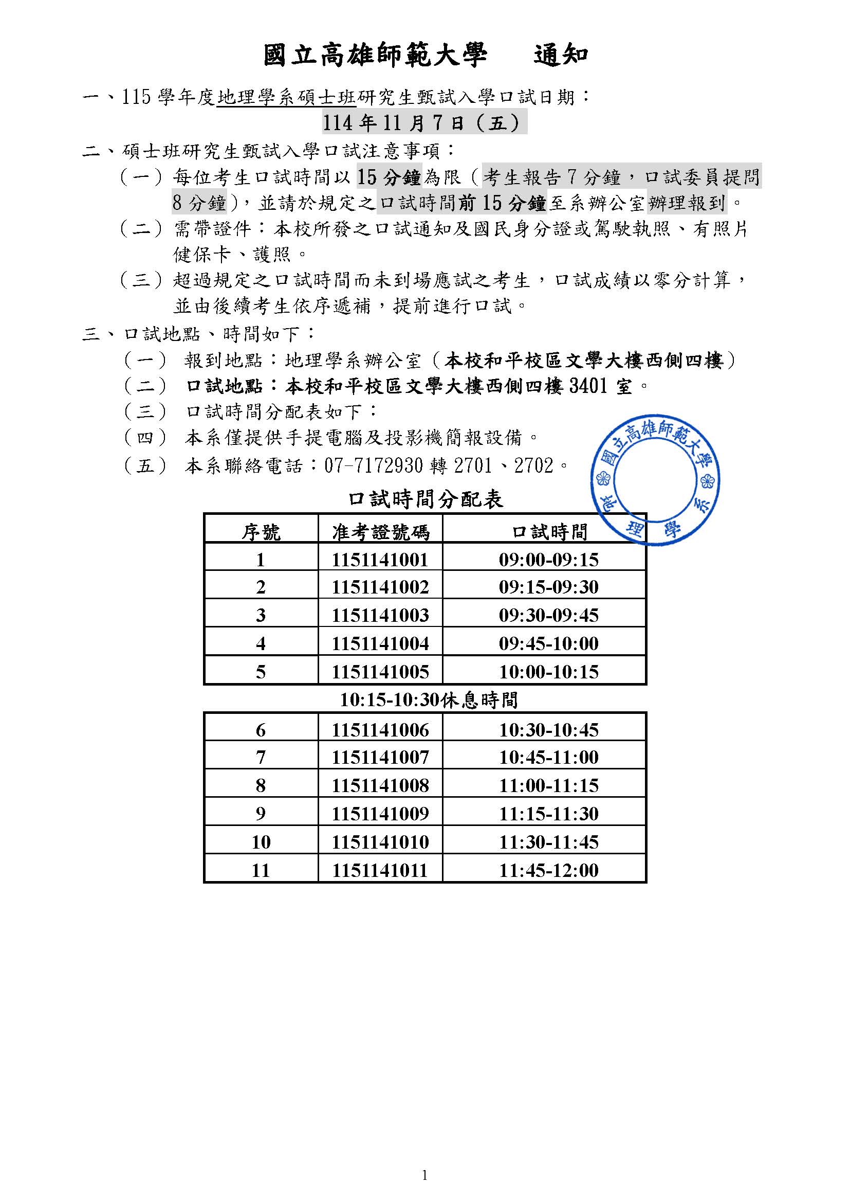 一、115學年度地理學系碩士班研究生甄試入學口試日期:1 1 4 年 1 1 月 7 日(五)